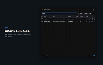 CookiePeek es un gestor de cookies diseñado para desarrolladores y probadores que desean un control total sobre las cookies de los sitios web. Este complemento de Chrome permite ver, buscar, editar y exportar cookies de forma rápida y sencilla. Su interfaz permite acceder a una tabla completa de cookies con un solo clic, donde se pueden buscar y ordenar según diferentes columnas, ofreciendo una experiencia sin complicaciones ni esperas.